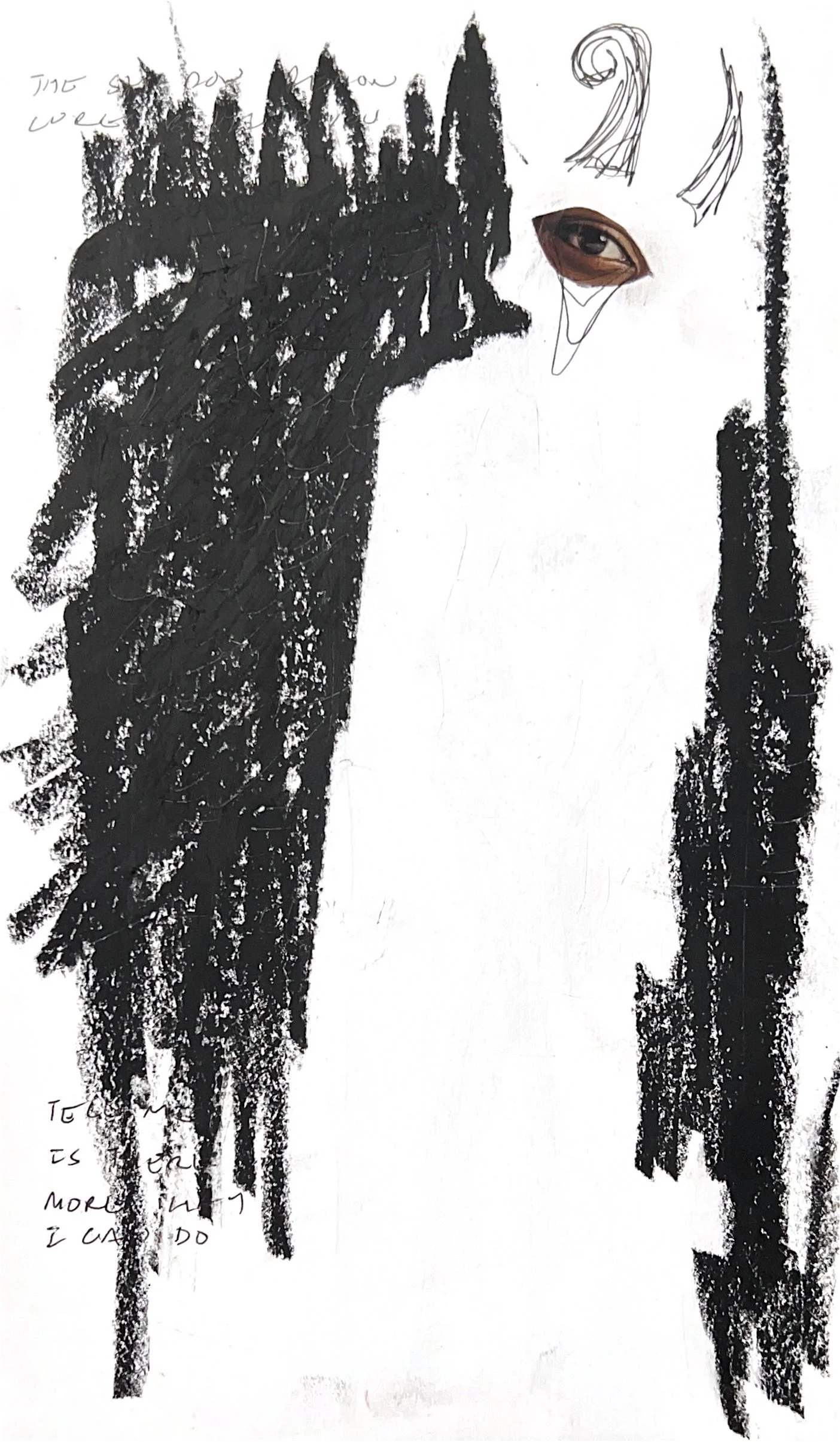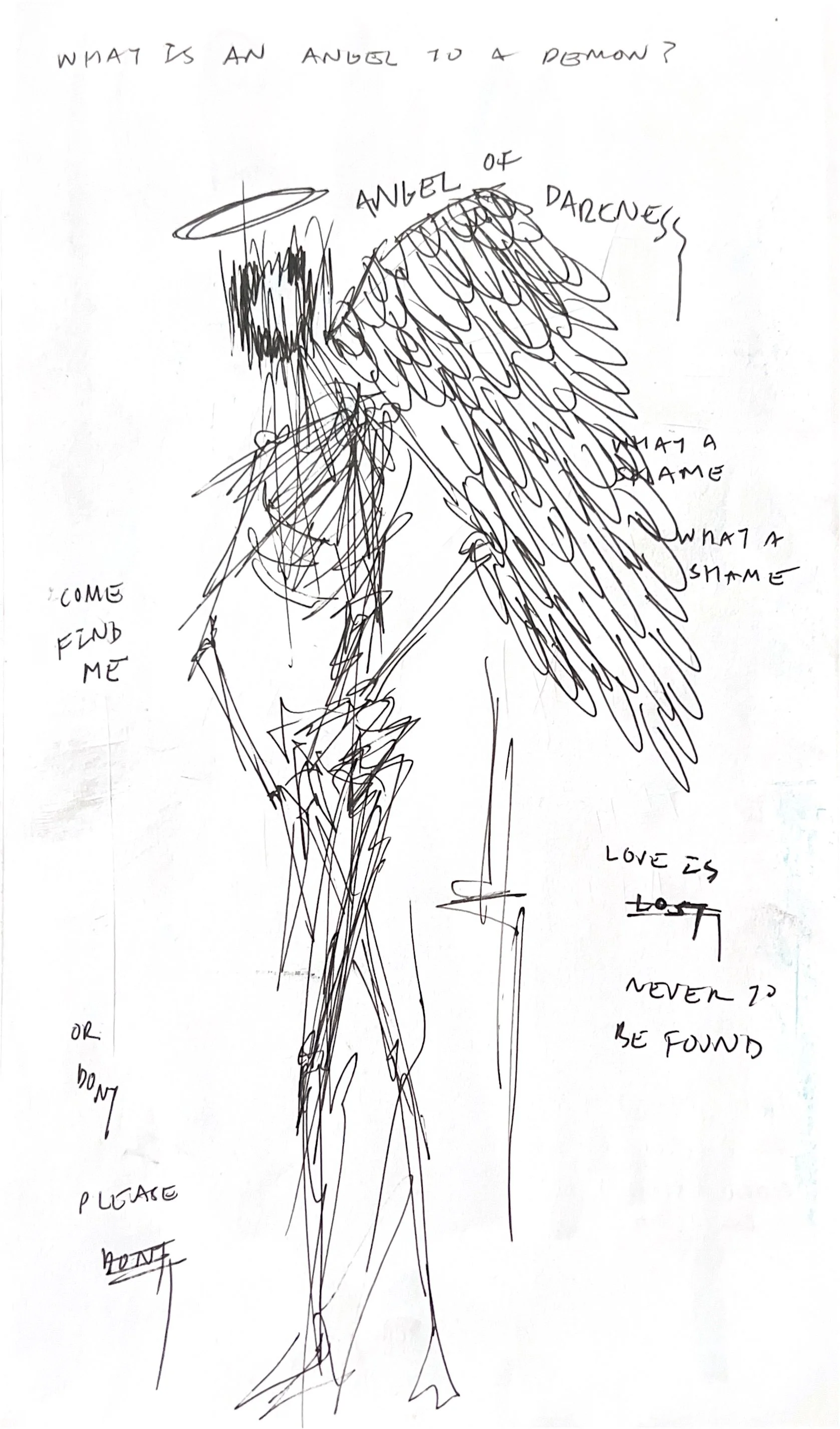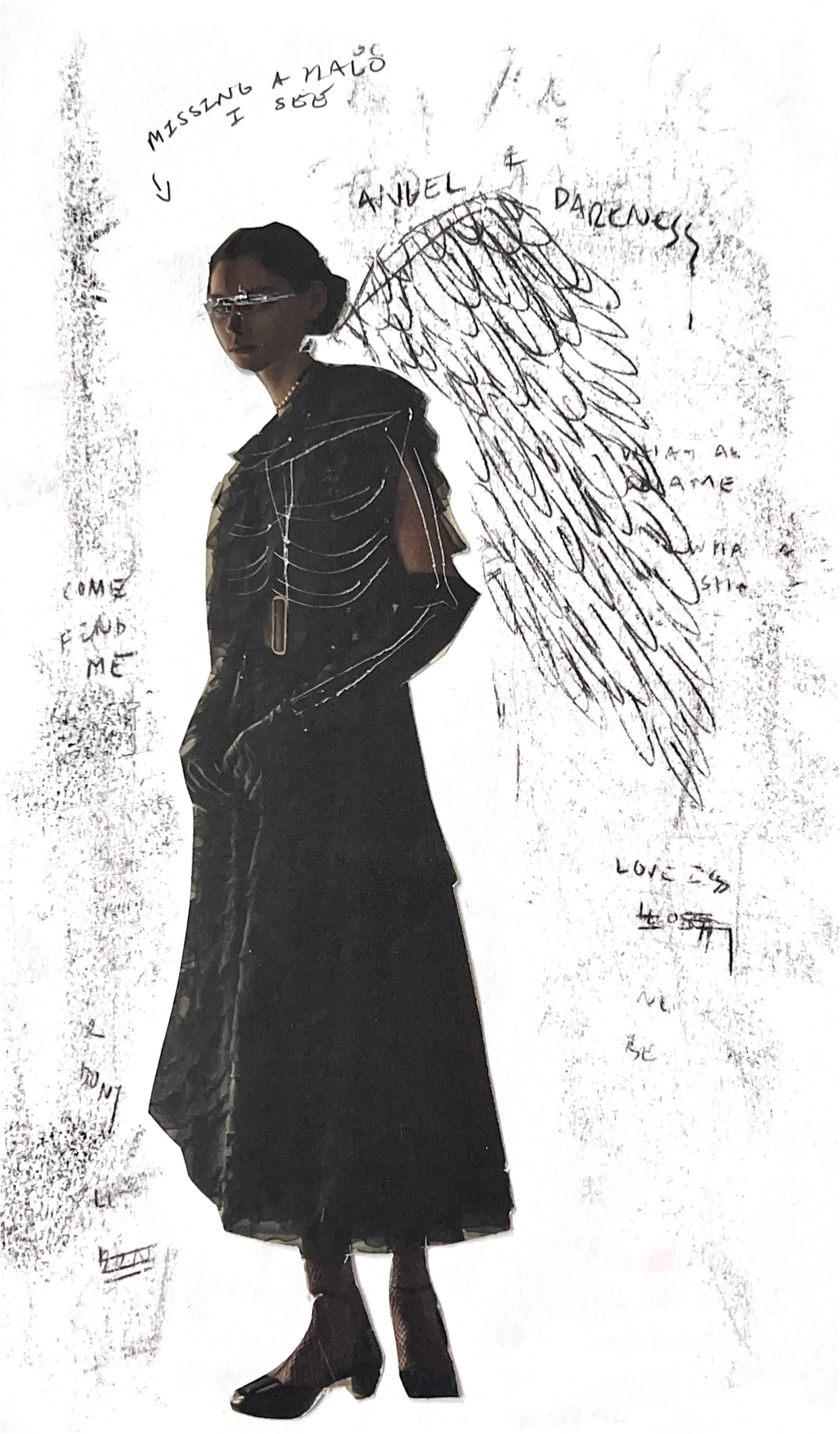 ANGEL OF DARKNESS 7 x 5 INCHESPEN, INK, MAGAZINE ADS, OIL PASTELS AN EXPERIMENT OF LAYERS IN THE TRANSFERING IMAGE AND TEXT USING OIL PASTELS AND PENMAKIING EACH PAGE STAND ALONE AND WORK COHESIVELY