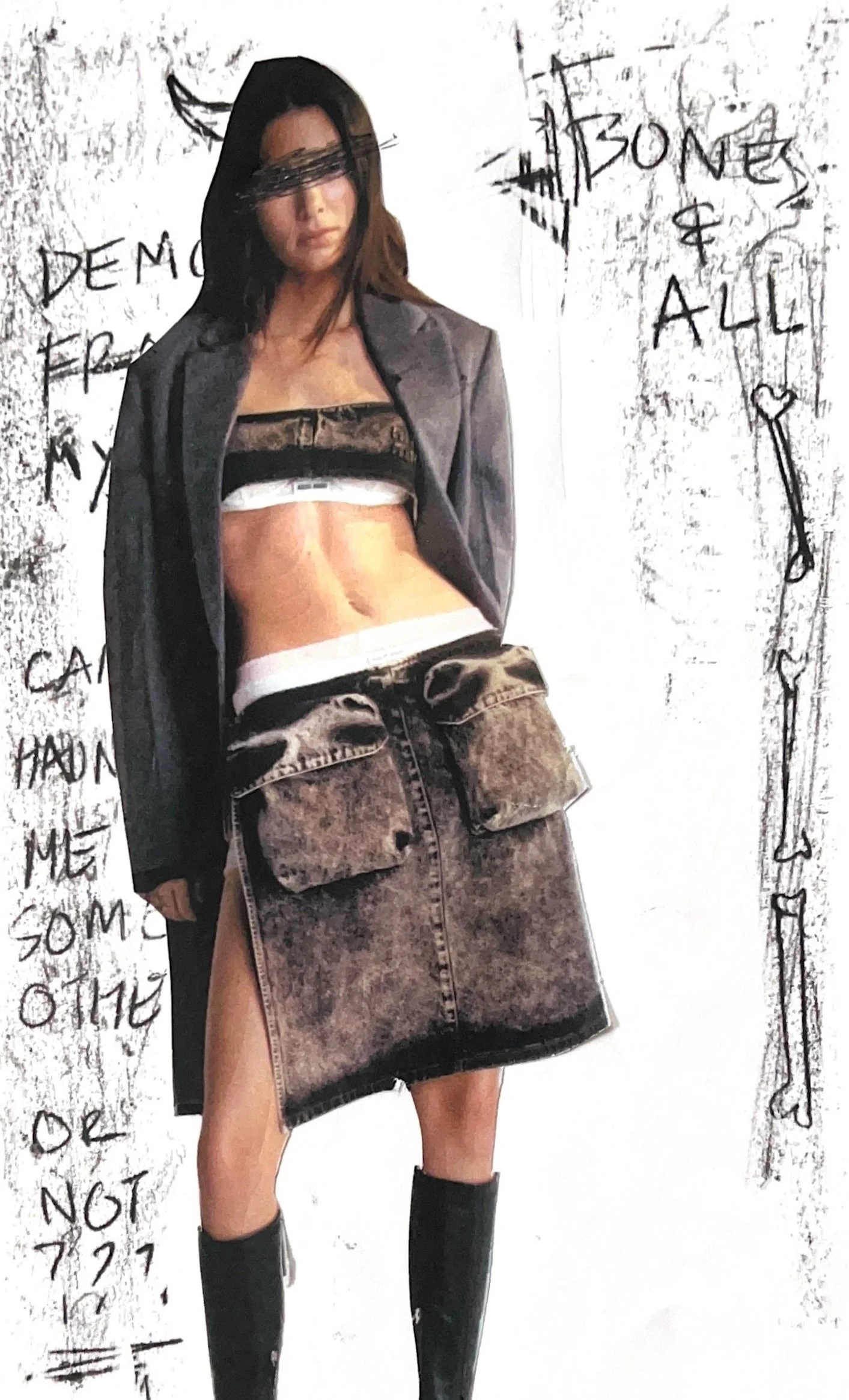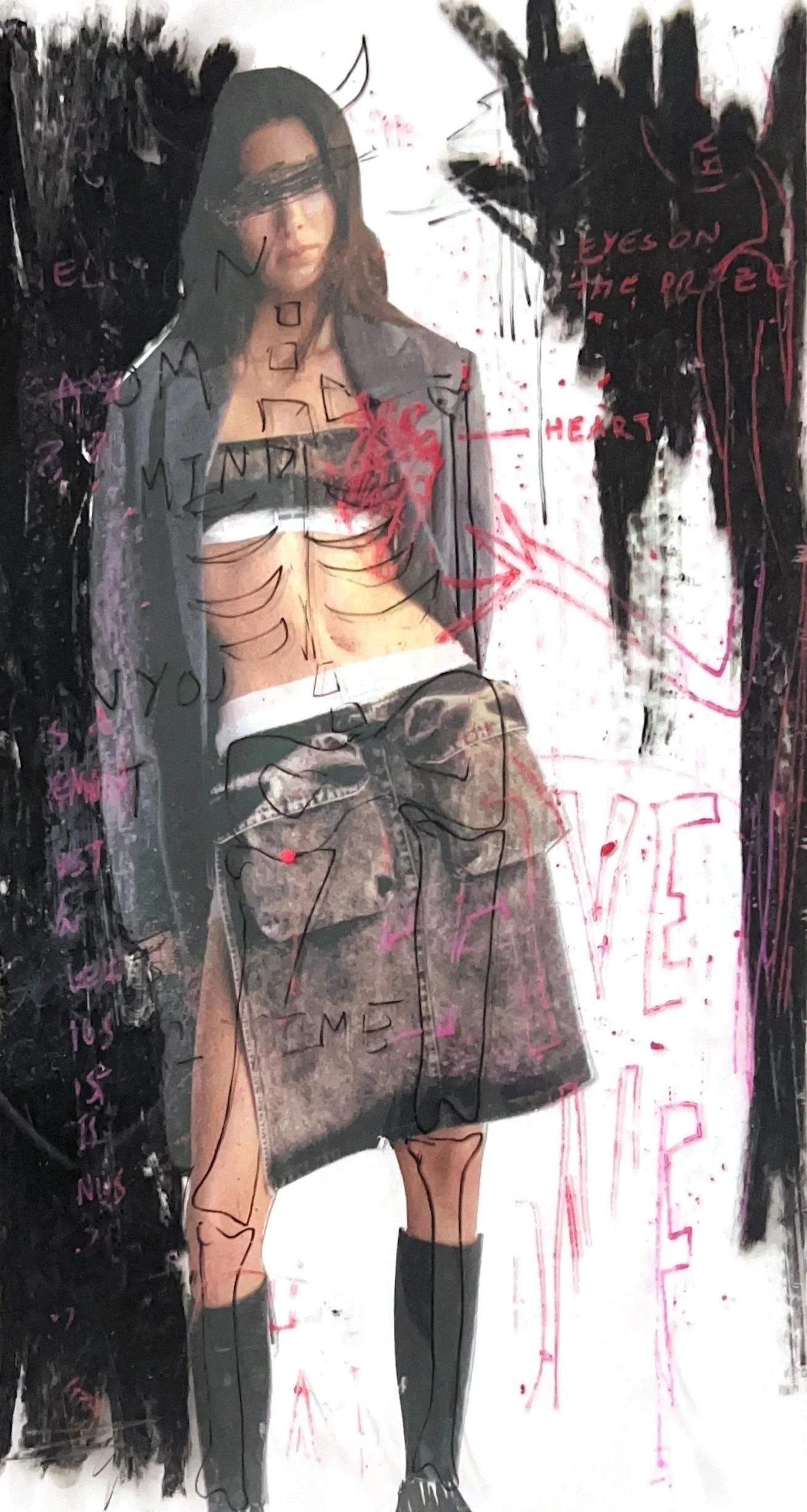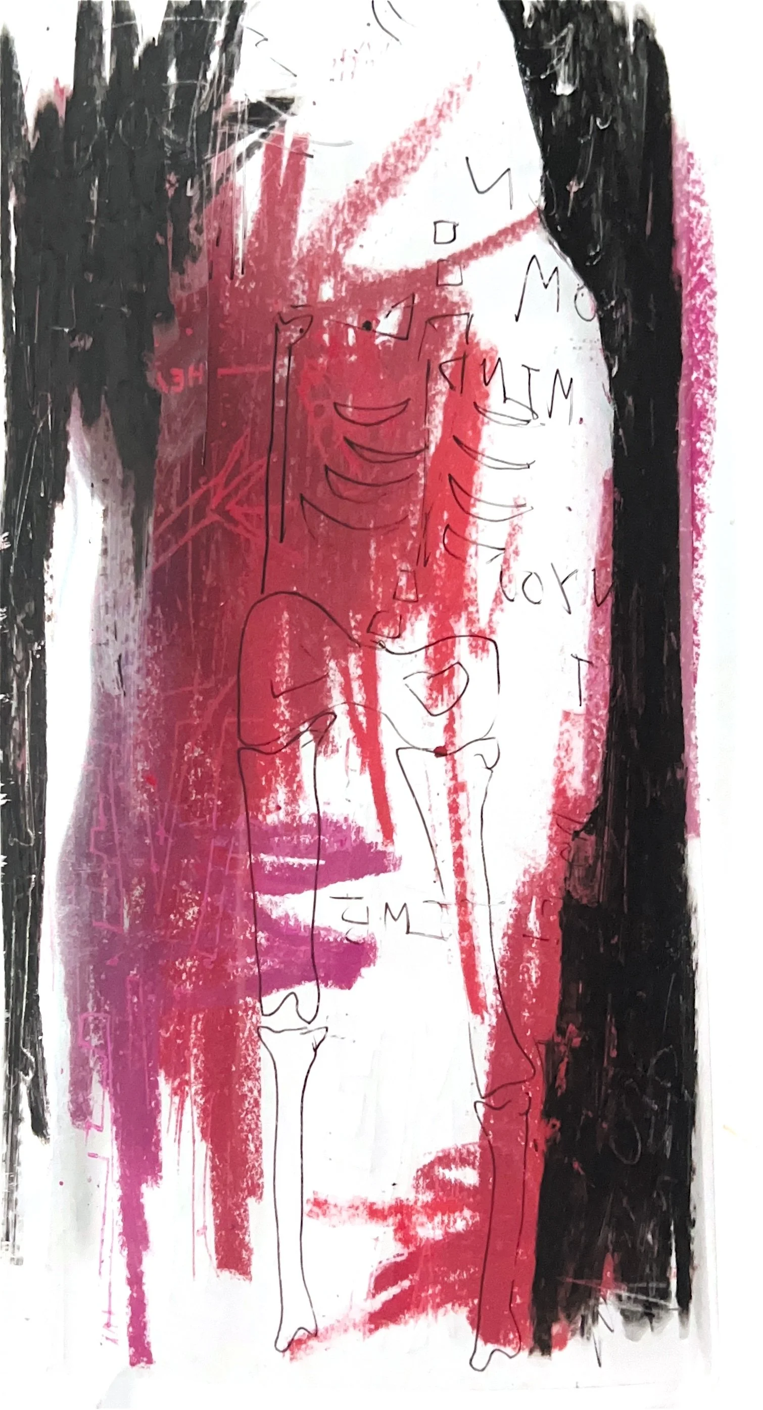 DEMON HEART 7 x 5 INCHESPEN, INK, MAGAZINE ADS, OIL PASTELS, ACETATE AN EXPERIMENT OF LAYERS IN THE TRANSFERING IMAGE AND TEXT USING ACETATE, OIL PASTELS AND PENCREATING QUICK PIECES USING UNCONSCIOUS THOUGHTS