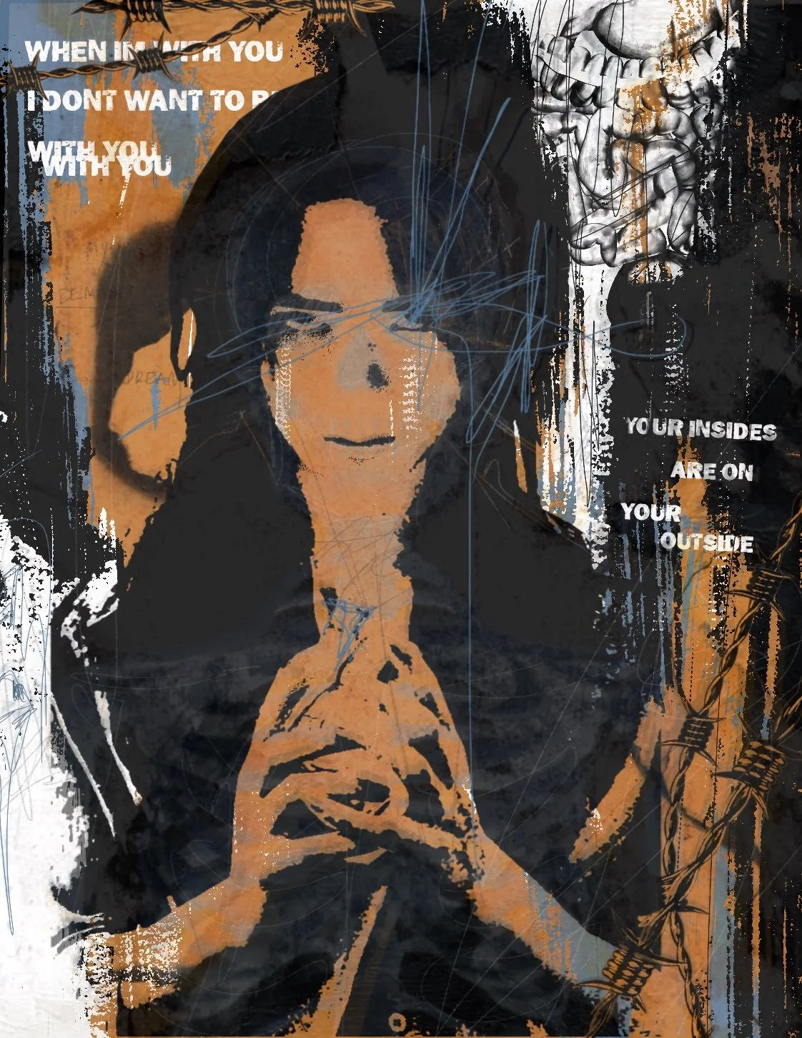 I DON’T WANT TO BE 8.5 X 11 INCHESPAINT, PEN, INK, PAINT MARKERS, OIL PASTELS, DIGITAL MEDIA, MATTE MEDIUM A MULTI MEDIA POSTER FOCUSED ON THE THEMES OF LOVE, HATE, AND DESTRUCTIONINSPIRED BY THE SONG COVET BY BASEMENT