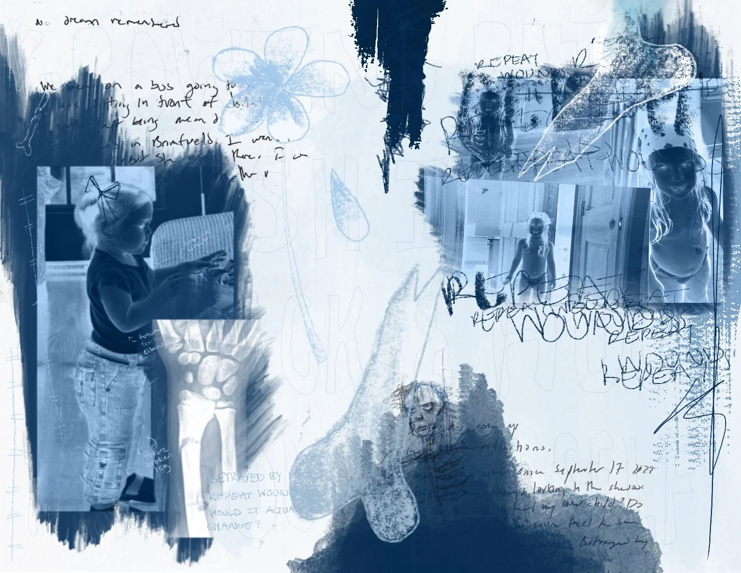 IN RIB FEELINGS 8.5 x 11 INCHESPAINT, PEN, INK, PAINT MARKERS, OIL PASTELS, MAGAZINE ADS, DIGITAL MEDIA MULTI MEDIA SPREADS AND PIECES INSPIRED BY THE NARRATIVES OF MY DREAMS AND UNCONSCIOUS MIND SENIOR THESIS AT PRATT INSTITUTE